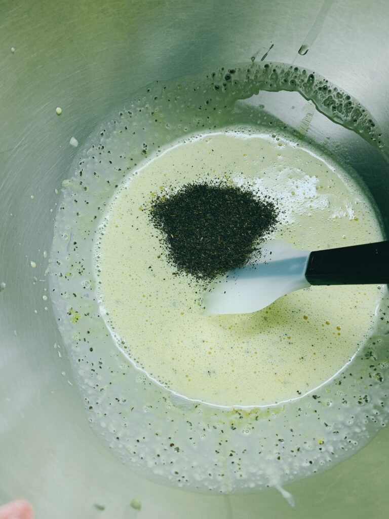 まず高速でツノが立つまで泡立てたら中速にしてゆっくりボウルにそって3週泡立て、さらに低速にして3週泡立てます。